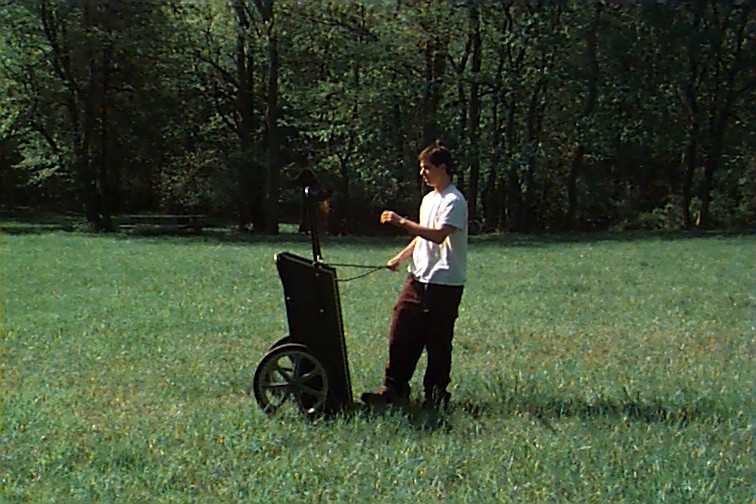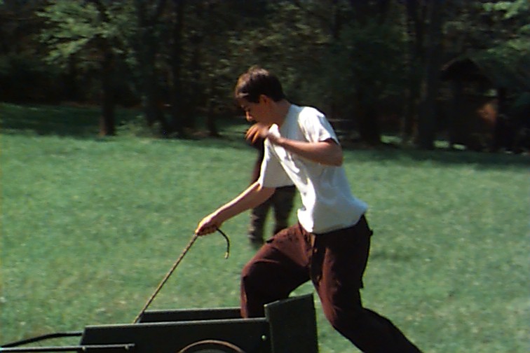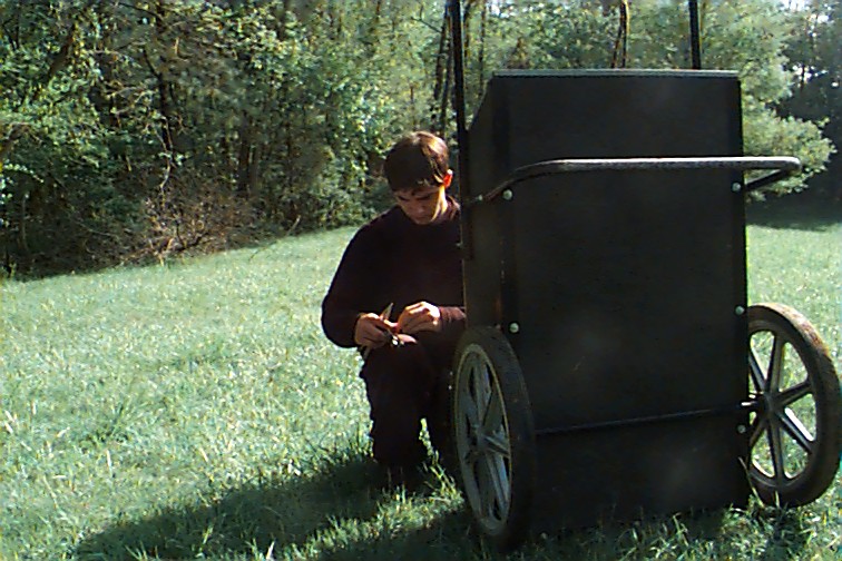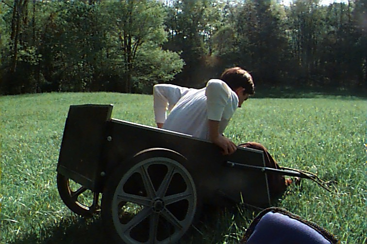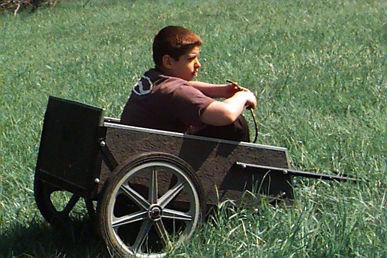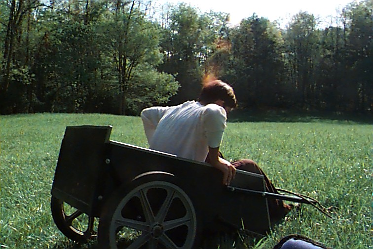 Margaret on the cart with Nancy the back of the head camera shy Look! I can catch!
